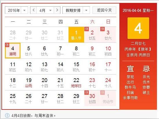4月4日清明节放假1天,与周末(4月2、3日)连休共3天。